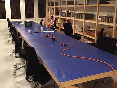 PJADAD Konstruktion och på plats byggda skrivbord och vägghylla. 43x43 virke med osb och plywood samt printade skivor.